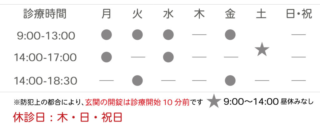 防犯上の都合により、玄関の開錠は診療開始10分前となっております。